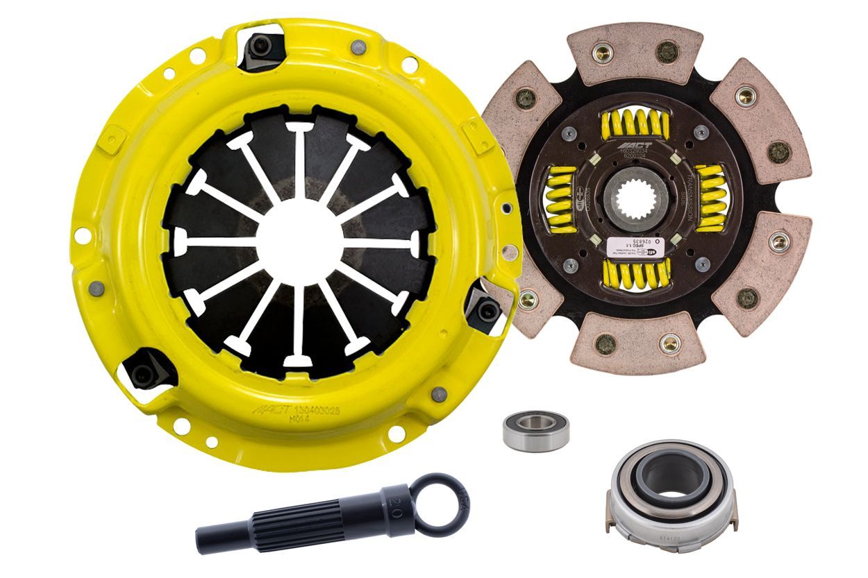 Advanced Clutch Transmission Clutch Kit - HC8-HDG6 ⚠ Check if this part fits your vehicle Select your vehicle to confirm fitment before you buy. Select vehicle ACT Heavy Duty Race Sprung 6 Pad Clutch Kit Manufacturer: Advanced Clutch $620.00 Ship to Select country United States of America Afghanistan Åland Islands Albania Algeria American Samoa Andorra Angola Anguilla Antarctica Antigua and Barbuda Argentina Armenia Aruba Australia Austria Azerbaijan Bahamas Bahrain Bangladesh Barbados Belarus Belgium Belize Benin Bermuda Bhutan Bolivia (Plurinational State of) Bonaire, Sint Eustatius and Saba Bosnia and Herzegovina Botswana Bouvet Island Brazil British Indian Ocean Territory Brunei Darussalam Bulgaria Burkina Faso Burundi Cabo Verde Cambodia Cameroon Canada Cayman Islands Central African Republic Chad Chile China Christmas Island Cocos (Keeling) Islands Colombia Comoros Congo Congo (Democratic Republic of the) Cook Islands Costa Rica Côte d'Ivoire Croatia Cuba Curaçao Cyprus Czechia Denmark Djibouti Dominica Dominican Republic Ecuador Egypt El Salvador Equatorial Guinea Eritrea Estonia Eswatini Ethiopia Falkland Islands (Malvinas) Faroe Islands Fiji Finland France French Guiana French Polynesia French Southern Territories Gabon Gambia Georgia Germany Ghana Gibraltar Greece Greenland Grenada Guadeloupe Guam Guatemala Guernsey Guinea Guinea-Bissau Guyana Haiti Heard Island and McDonald Islands Holy See Honduras Hong Kong Hungary Iceland India Indonesia Iran (Islamic Republic of) Iraq Ireland Isle of Man Israel Italy Jamaica Japan Jersey Jordan Kazakhstan Kenya Kiribati Korea (Democratic People's Republic of) Korea (Republic of) Kuwait Kyrgyzstan Lao People's Democratic Republic Latvia Lebanon Lesotho Liberia Libya Liechtenstein Lithuania Luxembourg Macao Madagascar Malawi Malaysia Maldives Mali Malta Marshall Islands Martinique Mauritania Mauritius Mayotte Mexico Micronesia (Federated States of) Moldova (Republic of) Monaco Mongolia Montenegro Montserrat Morocco Mozambique Myanmar Namibia Nauru Nepal Netherlands New Caledonia New Zealand Nicaragua Niger Nigeria Niue Norfolk Island North Macedonia Northern Mariana Islands Norway Oman Pakistan Palau Palestine, State of Panama Papua New Guinea Paraguay Peru Philippines Pitcairn Poland Portugal Puerto Rico Qatar Réunion Romania Russian Federation Rwanda Saint Barthélemy Saint Helena, Ascension and Tristan da Cunha Saint Kitts and Nevis Saint Lucia Saint Martin (French part) Saint Pierre and Miquelon Saint Vincent and the Grenadines Samoa San Marino Sao Tome and Principe Saudi Arabia Senegal Serbia Seychelles Sierra Leone Singapore Sint Maarten (Dutch part) Slovakia Slovenia Solomon Islands Somalia South Africa South Georgia and the South Sandwich Islands South Sudan Spain Sri Lanka Sudan Suriname Svalbard and Jan Mayen Sweden Switzerland Syrian Arab Republic Taiwan, Province of China Tajikistan Tanzania, United Republic of Thailand Timor-Leste Togo Tokelau Tonga Trinidad and Tobago Tunisia Turkey Turkmenistan Turks and Caicos Islands Tuvalu Uganda Ukraine United Arab Emirates United Kingdom of Great Britain and Northern Ireland United States Minor Outlying Islands Uruguay Uzbekistan Vanuatu Venezuela (Bolivarian Republic of) Vietnam Virgin Islands (British) Virgin Islands (U.S.) Wallis and Futuna Western Sahara Yemen Zambia Zimbabwe * Other * Shipping Method Name Estimated Delivery Price No shipping options Apply Custom wishlist OK Add to wishlist Add to compare list Email a friend HC8-HDG6 kit features ACT's most popular Heavy Duty pressure plate. ACT Heavy Duty pressure plates use exclusive diaphragm design to increase clamp load, reduce deflection and maximize clutch life. All diaphragms endure a four-stage, heat-treating process for unparalleled performance. ACT pressure plates have precision cover stampings to provide rigidity and consistency. ACT's 6-pad, spring-centered race disc features a spring-center to properly damp torsional vibrations and resist failure under harsh conditions. ACT spring retainers utilize wraparound spring windows and thicker retainer stampings to provide spring support, reduce stress concentrations, and increase strength and reliability. With the 6-pad, spring-centered race disc, engagement is harsher, but shifting is faster. The 6-pad, spring-centered disc is recommended for larger clutch sizes to absorb more heat.Note: Light to moderate pedal effort, aggressive engagement, OE to mild gear rattle; Moderate friction life, extended by ACT's exclusive diaphragm design; Carefully engineered, precisely assembled, accurately balanced, uses select ceramic friction materials for high heat tolerance and maximum performance; Recommended for high horsepower street or race use; 100% clamp load tested and dynamically computer balanced for smooth high RPM reliability Products specifications Attribute name Attribute value Input Shaft Diameter 0.875 Product Weight (lbs.) 10.8 Input Spline Quantity 20 Clutch Disc Diameter 200, 7.9 Torque Capacity (ft/lbs.) 270 Torque Capacity Over OE 76% Disc Material Ceramic Pressure Plate Type Heavy Duty Part Fitment Requirement Must be used with factory flywheel. Pilot Bushing Included No Prop 65 - Short Label WARNING: Cancer and Reproductive Harm - www.p65warnings.ca.gov Prop 65 Long Label Warning: This product can expose you to chemicals including carbon black, glass wool fibers, or silica (in clutch discs), chromium and nickel, which are known to the State of California to cause cancer or birth defects or other reproductive harm. For more information, visit www.P65Warnings.ca.gov Release Bearing Included Yes Alignment Tool Included Yes Prop 65 Yes/No Yes Disc Type Sprung Solid Sprung Clutch Slave Cylinder Included No Clutch Master Cylinder Included No Pressure Plate Bolts Included No Grease Included Yes Grade Type Performance Flywheel Bolts Included No Pilot Bearing Included Yes Country of Origin JP Condition New 🚗 Compatible with 2 vehicles are compatible with this product Yea