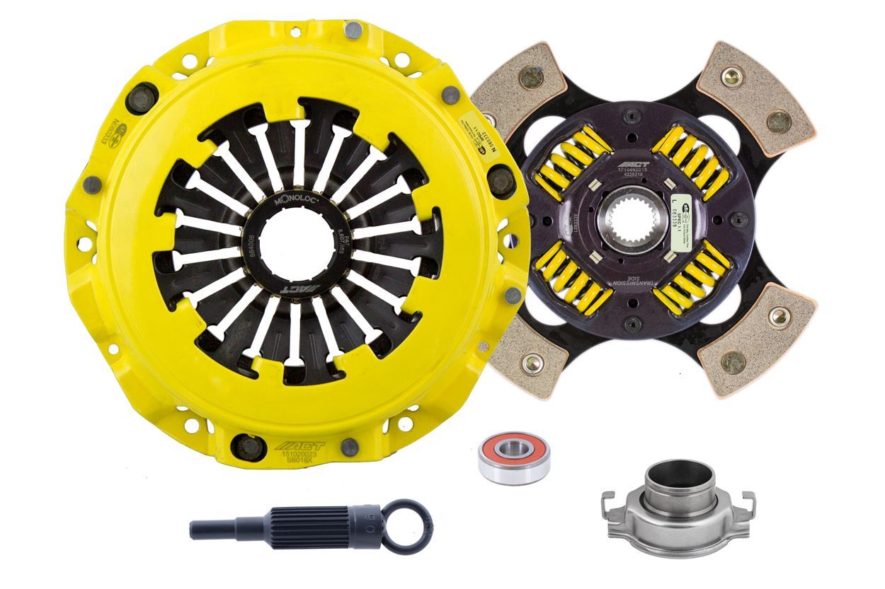 SB9-XTG4 kit features an Xtreme pressure plate for the most demanding driver. ACT Xtreme pressure plates use exclusive diaphragm design to increase clamp load, reduce deflection and maximize clutch life. All diaphragms endure a four-stage, heat-treating process for unparalleled performance. ACT pressure plates have precision cover stampings to provide rigidity and consistency. ACT's 4-pad spring-centered race disc features a spring-center construction to properly damp torsional vibrations for quieter operation and resist failure even under harsh conditions. ACT spring retainers utilize wraparound spring windows and thicker retainer stampings to provide spring support, reduce stress concentrations, and increase strength and reliability. With the 4-pad spring-centered race disc, engagement is harsher, but shifting is faster. ACT's 4-pad spring-centered race disc is well-suited for smaller disc sizes in smaller engines. Monoloc is a one-piece, direct replacement or upgrade to the standard, two-piece wedge collar and wire ring featured in pull-type clutches. The spring tension of the segmented retaining ring is carefully calculated and tested for optimal performance. It provides uniform loading on the bearing and pressure plate to assure proper alignment, regardless of driver influence or vehicle modifications. Monoloc's hardened chrome-moly steel construction will provide years of service.