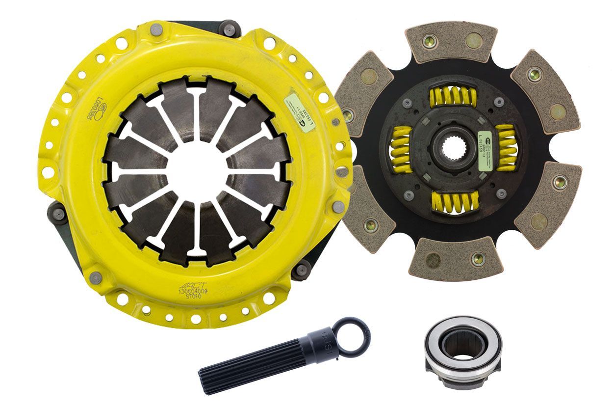 Advanced Clutch Transmission Clutch Kit - ST1-HDG6 ⚠ Check if this part fits your vehicle Select your vehicle to confirm fitment before you buy. Select vehicle ACT Heavy Duty Race Sprung 6 Pad Clutch Kit Manufacturer: Advanced Clutch $741.00 Qty: Add to cart Ship to Select country United States of America Afghanistan Åland Islands Albania Algeria American Samoa Andorra Angola Anguilla Antarctica Antigua and Barbuda Argentina Armenia Aruba Australia Austria Azerbaijan Bahamas Bahrain Bangladesh Barbados Belarus Belgium Belize Benin Bermuda Bhutan Bolivia (Plurinational State of) Bonaire, Sint Eustatius and Saba Bosnia and Herzegovina Botswana Bouvet Island Brazil British Indian Ocean Territory Brunei Darussalam Bulgaria Burkina Faso Burundi Cabo Verde Cambodia Cameroon Canada Cayman Islands Central African Republic Chad Chile China Christmas Island Cocos (Keeling) Islands Colombia Comoros Congo Congo (Democratic Republic of the) Cook Islands Costa Rica Côte d'Ivoire Croatia Cuba Curaçao Cyprus Czechia Denmark Djibouti Dominica Dominican Republic Ecuador Egypt El Salvador Equatorial Guinea Eritrea Estonia Eswatini Ethiopia Falkland Islands (Malvinas) Faroe Islands Fiji Finland France French Guiana French Polynesia French Southern Territories Gabon Gambia Georgia Germany Ghana Gibraltar Greece Greenland Grenada Guadeloupe Guam Guatemala Guernsey Guinea Guinea-Bissau Guyana Haiti Heard Island and McDonald Islands Holy See Honduras Hong Kong Hungary Iceland India Indonesia Iran (Islamic Republic of) Iraq Ireland Isle of Man Israel Italy Jamaica Japan Jersey Jordan Kazakhstan Kenya Kiribati Korea (Democratic People's Republic of) Korea (Republic of) Kuwait Kyrgyzstan Lao People's Democratic Republic Latvia Lebanon Lesotho Liberia Libya Liechtenstein Lithuania Luxembourg Macao Madagascar Malawi Malaysia Maldives Mali Malta Marshall Islands Martinique Mauritania Mauritius Mayotte Mexico Micronesia (Federated States of) Moldova (Republic of) Monaco Mongolia Montenegro Montserrat Morocco Mozambique Myanmar Namibia Nauru Nepal Netherlands New Caledonia New Zealand Nicaragua Niger Nigeria Niue Norfolk Island North Macedonia Northern Mariana Islands Norway Oman Pakistan Palau Palestine, State of Panama Papua New Guinea Paraguay Peru Philippines Pitcairn Poland Portugal Puerto Rico Qatar Réunion Romania Russian Federation Rwanda Saint Barthélemy Saint Helena, Ascension and Tristan da Cunha Saint Kitts and Nevis Saint Lucia Saint Martin (French part) Saint Pierre and Miquelon Saint Vincent and the Grenadines Samoa San Marino Sao Tome and Principe Saudi Arabia Senegal Serbia Seychelles Sierra Leone Singapore Sint Maarten (Dutch part) Slovakia Slovenia Solomon Islands Somalia South Africa South Georgia and the South Sandwich Islands South Sudan Spain Sri Lanka Sudan Suriname Svalbard and Jan Mayen Sweden Switzerland Syrian Arab Republic Taiwan, Province of China Tajikistan Tanzania, United Republic of Thailand Timor-Leste Togo Tokelau Tonga Trinidad and Tobago Tunisia Turkey Turkmenistan Turks and Caicos Islands Tuvalu Uganda Ukraine United Arab Emirates United Kingdom of Great Britain and Northern Ireland United States Minor Outlying Islands Uruguay Uzbekistan Vanuatu Venezuela (Bolivarian Republic of) Vietnam Virgin Islands (British) Virgin Islands (U.S.) Wallis and Futuna Western Sahara Yemen Zambia Zimbabwe * Other * Shipping Method Name Estimated Delivery Price No shipping options Apply Custom wishlist OK Add to wishlist Add to compare list Email a friend ST1-HDG6 kit features ACT's most popular Heavy Duty pressure plate. ACT Heavy Duty pressure plates use exclusive diaphragm design to increase clamp load, reduce deflection and maximize clutch life. All diaphragms endure a four-stage, heat-treating process for unparalleled performance. ACT pressure plates have precision cover stampings to provide rigidity and consistency. ACT's 6-pad, spring-centered race disc features a spring-center to properly damp torsional vibrations and resist failure under harsh conditions. ACT spring retainers utilize wraparound spring windows and thicker retainer stampings to provide spring support, reduce stress concentrations, and increase strength and reliability. With the 6-pad, spring-centered race disc, engagement is harsher, but shifting is faster. The 6-pad, spring-centered disc is recommended for larger clutch sizes to absorb more heat.Note: Light to moderate pedal effort, aggressive engagement, OE to mild gear rattle; Moderate friction life, extended by ACT's exclusive diaphragm design; Carefully engineered, precisely assembled, accurately balanced, uses select ceramic friction materials for high heat tolerance and maximum performance; Recommended for high horsepower street or race use; 100% clamp load tested and dynamically computer balanced for smooth high RPM reliability Products specifications Attribute name Attribute value Product Weight (lbs.) 11.1 Torque Capacity (ft/lbs.) 320 Torque Capacity Over OE 74% Prop 65 - Short Label WARNING: Cancer and Reproductive Harm - www.p65warnings.ca.gov Prop 65 Long Label Warning: This product can expose you to chemicals including carbon black, glass wool fibers, or silica (in clutch discs), chromium and nickel, which are known to the State of California to cause cancer or birth defects or other reproductive harm. For more information, visit www.P65Warnings.ca.gov Prop 65 Yes/No Yes Clutch Disc Diameter 8.4, 214 Disc Material Ceramic Input Spline Quantity 22 Input Shaft Diameter 1 Alignment Tool Included Yes Disc Type Sprung Solid Sprung Pressure Plate Bolts Included No Grease Included Yes Grade Type Performance Clutch Slave Cylinder Included No Flywheel Bolts Included No Pilot Bearing Included No Clutch Master Cylinder Included No Flywheel Included No Pilot Bushing Included No Pressure Plate Type Heavy Duty Release Bearing Included Yes Country of Origin KR Condition New 🚗 Compatible with 57 vehicles are compatible with this product Year Make Model 1991 Saturn SC