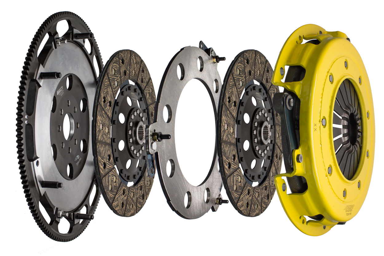 Advanced Clutch Transmission Clutch Kit - T1S-F05 ⚠ Check if this part fits your vehicle Select your vehicle to confirm fitment before you buy. Select vehicle ACT Twin Disc Heavy Duty Street Clutch Kit Manufacturer: Advanced Clutch $1,521.00 Qty: Add to cart Ship to Select country United States of America Afghanistan Åland Islands Albania Algeria American Samoa Andorra Angola Anguilla Antarctica Antigua and Barbuda Argentina Armenia Aruba Australia Austria Azerbaijan Bahamas Bahrain Bangladesh Barbados Belarus Belgium Belize Benin Bermuda Bhutan Bolivia (Plurinational State of) Bonaire, Sint Eustatius and Saba Bosnia and Herzegovina Botswana Bouvet Island Brazil British Indian Ocean Territory Brunei Darussalam Bulgaria Burkina Faso Burundi Cabo Verde Cambodia Cameroon Canada Cayman Islands Central African Republic Chad Chile China Christmas Island Cocos (Keeling) Islands Colombia Comoros Congo Congo (Democratic Republic of the) Cook Islands Costa Rica Côte d'Ivoire Croatia Cuba Curaçao Cyprus Czechia Denmark Djibouti Dominica Dominican Republic Ecuador Egypt El Salvador Equatorial Guinea Eritrea Estonia Eswatini Ethiopia Falkland Islands (Malvinas) Faroe Islands Fiji Finland France French Guiana French Polynesia French Southern Territories Gabon Gambia Georgia Germany Ghana Gibraltar Greece Greenland Grenada Guadeloupe Guam Guatemala Guernsey Guinea Guinea-Bissau Guyana Haiti Heard Island and McDonald Islands Holy See Honduras Hong Kong Hungary Iceland India Indonesia Iran (Islamic Republic of) Iraq Ireland Isle of Man Israel Italy Jamaica Japan Jersey Jordan Kazakhstan Kenya Kiribati Korea (Democratic People's Republic of) Korea (Republic of) Kuwait Kyrgyzstan Lao People's Democratic Republic Latvia Lebanon Lesotho Liberia Libya Liechtenstein Lithuania Luxembourg Macao Madagascar Malawi Malaysia Maldives Mali Malta Marshall Islands Martinique Mauritania Mauritius Mayotte Mexico Micronesia (Federated States of) Moldova (Republic of) Monaco Mongolia Montenegro Montserrat Morocco Mozambique Myanmar Namibia Nauru Nepal Netherlands New Caledonia New Zealand Nicaragua Niger Nigeria Niue Norfolk Island North Macedonia Northern Mariana Islands Norway Oman Pakistan Palau Palestine, State of Panama Papua New Guinea Paraguay Peru Philippines Pitcairn Poland Portugal Puerto Rico Qatar Réunion Romania Russian Federation Rwanda Saint Barthélemy Saint Helena, Ascension and Tristan da Cunha Saint Kitts and Nevis Saint Lucia Saint Martin (French part) Saint Pierre and Miquelon Saint Vincent and the Grenadines Samoa San Marino Sao Tome and Principe Saudi Arabia Senegal Serbia Seychelles Sierra Leone Singapore Sint Maarten (Dutch part) Slovakia Slovenia Solomon Islands Somalia South Africa South Georgia and the South Sandwich Islands South Sudan Spain Sri Lanka Sudan Suriname Svalbard and Jan Mayen Sweden Switzerland Syrian Arab Republic Taiwan, Province of China Tajikistan Tanzania, United Republic of Thailand Timor-Leste Togo Tokelau Tonga Trinidad and Tobago Tunisia Turkey Turkmenistan Turks and Caicos Islands Tuvalu Uganda Ukraine United Arab Emirates United Kingdom of Great Britain and Northern Ireland United States Minor Outlying Islands Uruguay Uzbekistan Vanuatu Venezuela (Bolivarian Republic of) Vietnam Virgin Islands (British) Virgin Islands (U.S.) Wallis and Futuna Western Sahara Yemen Zambia Zimbabwe * Other * Shipping Method Name Estimated Delivery Price No shipping options Apply Custom wishlist OK Add to wishlist Add to compare list Email a friend T1S-F05 street, twin disc kit offers twice the number of disc surfaces for better wear, heat capacity and long life compared to single disc kits. These kits use a proprietary Positive Lift Floater System design, which results in quiet operation with no floater rattle and no posts to wear. ACT twin disc kits endure an exclusive four-stage, heat-treating process on all diaphragms. The ACT twin disc kits features the ability to adjust for disc wear and provides equal disengagement for discs. The Performance street rigid-hub discs feature premium organic materials with high copper content for better heat transfer and steel-backed lining for greater burst strength and durability. The chrome-moly hub is heat-treated for strength and durability. Rivet design and materials are carefully selected for maximum strength. All ACT twin disc kits include a CNC-machined and dynamically balanced flywheel to ensure trouble-free installation and operation. ACT twin disc kits include a pressure plate, two discs, a floater, flywheel and alignment tool. Some kits may include a pilot bearing and release bearing.Note: Light pedal effort, smooth engagement, OE to mild gear rattle; Disc surfaces doubled for better wear, heat capacity and longer life, further extended by ACT's exclusive diaphragm design; Carefully engineered, precisely assembled, accurately balanced, with premium organic friction materials for heat tolerance and reduced fade; Recommended for high horsepower street or race use; 100% clamp load tested and dynamically computer balanced for smooth high RPM reliability Products specifications Attribute name Attribute value Input Shaft Diameter 1 SFI 1.2 Clutch Disc Diameter 10.5, 267 Input Spline Quantity 23 Product Weight (lbs.) 44.3 Torque Capacity Over OE 89% Torque Capacity (ft/lbs.) 891 Pilot Bushing Included No Disc Material Organic Part Fitment Requirement Verify that this kit's bolt pattern and spline count matches your vehicle. Prop 65 - Short Label WARNING: Cancer and Reproductive Harm - www.p65warnings.ca.gov Prop 65 Long Label Warning: This product can expose you to chemicals including carbon black, glass wool fibers, or silica (in clutch discs), chromium and nickel, which are known to the State of California to cause cancer or birth defects or other reproductive harm. For more information, visit www.P65Warnings.ca.gov Flywheel Included Yes Alignment Tool Included Yes Prop 65 Yes/No Yes Disc Type Sprung Solid Solid Clutch Slave Cylinder Include