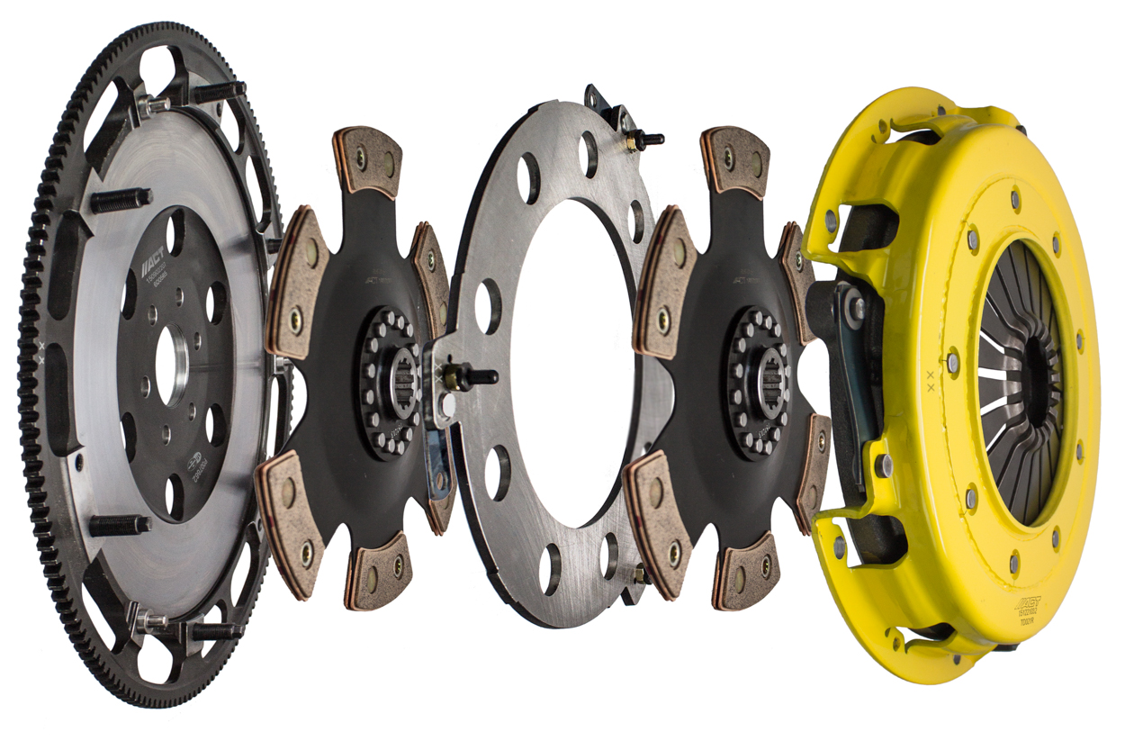 T2R-F02 race, twin disc kit offers twice the number of disc surfaces for better wear, heat capacity and long life compared to single disc kits. These kits use a proprietary Positive Lift Floater System design, which results in quiet operation with no floater rattle and no posts to wear. ACT twin disc kits undergo an exclusive four-stage, heat-treating process on all diaphragms. The ACT twin disc features the ability to adjust for disc wear and provides equal disengagement for discs. ACT's 6-pad rigid race discs are made with high quality, ceramic friction materials. The chrome-moly hub is heat-treated for strength and durability. The lightweight, rigid design allows for quicker shifts and trouble-free service. All ACT twin disc kits include a CNC-machined and dynamically balanced flywheel to ensure trouble-free installation and operation. ACT twin disc kits include a pressure plate, two discs, a floater, flywheel and alignment tool. Some kits may include a pilot bearing and release bearing.