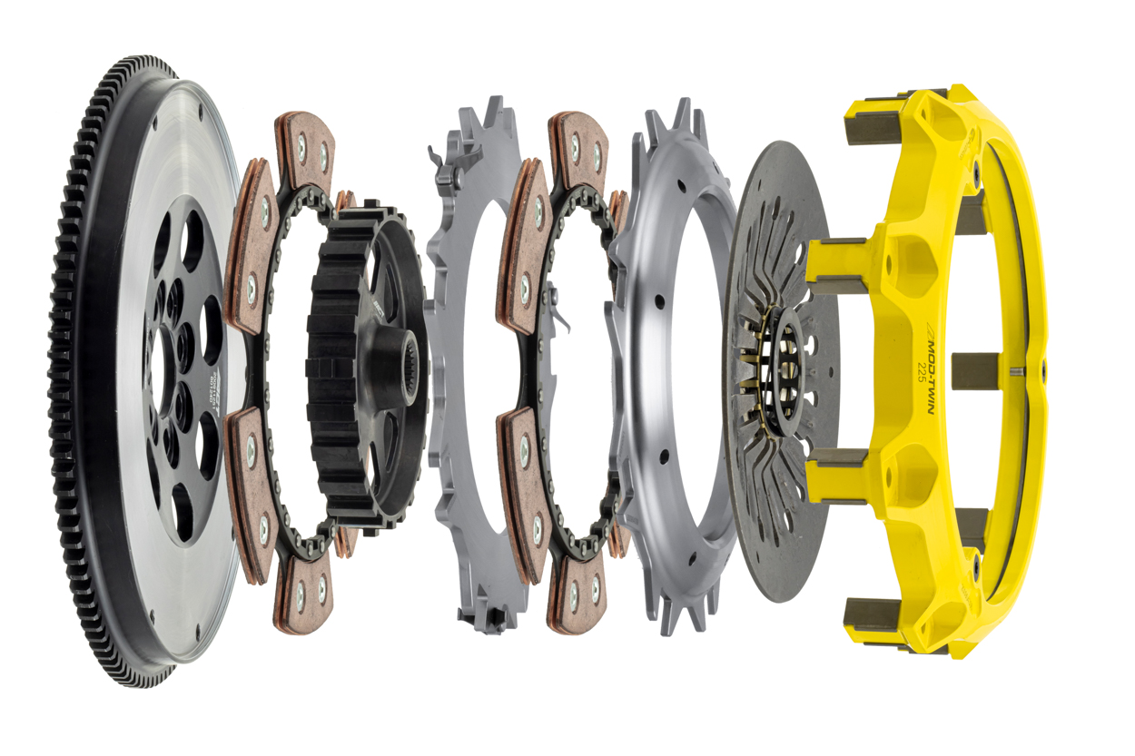T2R-M07 Mod-Twin 225 XT Rigid Race Kit tackles aggressive launches and rapid shifting of high powered AWD’s by combining twice the ceramic friction surfaces with a no-nonsense solid Mono-Drive hub in a completely modular design. Each diaphragm spring endures an exclusive four-stage heat treating process providing a consistent light pedal feel. Puck-style Friction Plates with high quality ceramic friction materials deliver high friction coefficient, superior heat capacity, and long clutch life. These Friction Plates uniformly transfer torque to a Mono-Drive chrome-moly hub which is heat treated for strength and durability extending input shaft life with one continuous spline. The lightweight, rigid design allows for quicker shifts and trouble-free service. This kit includes a CNC-machined and dynamically balanced flywheel, pressure plate cover, diaphragm spring, face, puck-style ceramic friction plates, rigid Mono-Drive hub, floater, patented Monoloc Collar, release bearing, alignment tool and pilot bearing (if needed). Mod-Twin clutches are fully rebuildable and most components can be ordered separately.