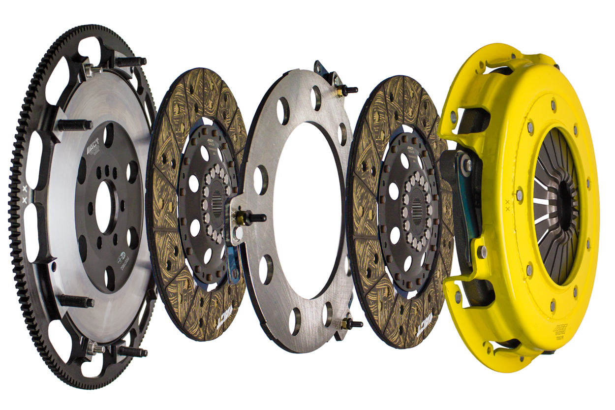 Advanced Clutch Transmission Clutch Kit - T2S-G02 ⚠ Check if this part fits your vehicle Select your vehicle to confirm fitment before you buy. Select vehicle ACT Twin Disc Extreme Street Clutch Kit Manufacturer: Advanced Clutch $1,575.00 Qty: Add to cart Ship to Select country United States of America Afghanistan Åland Islands Albania Algeria American Samoa Andorra Angola Anguilla Antarctica Antigua and Barbuda Argentina Armenia Aruba Australia Austria Azerbaijan Bahamas Bahrain Bangladesh Barbados Belarus Belgium Belize Benin Bermuda Bhutan Bolivia (Plurinational State of) Bonaire, Sint Eustatius and Saba Bosnia and Herzegovina Botswana Bouvet Island Brazil British Indian Ocean Territory Brunei Darussalam Bulgaria Burkina Faso Burundi Cabo Verde Cambodia Cameroon Canada Cayman Islands Central African Republic Chad Chile China Christmas Island Cocos (Keeling) Islands Colombia Comoros Congo Congo (Democratic Republic of the) Cook Islands Costa Rica Côte d'Ivoire Croatia Cuba Curaçao Cyprus Czechia Denmark Djibouti Dominica Dominican Republic Ecuador Egypt El Salvador Equatorial Guinea Eritrea Estonia Eswatini Ethiopia Falkland Islands (Malvinas) Faroe Islands Fiji Finland France French Guiana French Polynesia French Southern Territories Gabon Gambia Georgia Germany Ghana Gibraltar Greece Greenland Grenada Guadeloupe Guam Guatemala Guernsey Guinea Guinea-Bissau Guyana Haiti Heard Island and McDonald Islands Holy See Honduras Hong Kong Hungary Iceland India Indonesia Iran (Islamic Republic of) Iraq Ireland Isle of Man Israel Italy Jamaica Japan Jersey Jordan Kazakhstan Kenya Kiribati Korea (Democratic People's Republic of) Korea (Republic of) Kuwait Kyrgyzstan Lao People's Democratic Republic Latvia Lebanon Lesotho Liberia Libya Liechtenstein Lithuania Luxembourg Macao Madagascar Malawi Malaysia Maldives Mali Malta Marshall Islands Martinique Mauritania Mauritius Mayotte Mexico Micronesia (Federated States of) Moldova (Republic of) Monaco Mongolia Montenegro Montserrat Morocco Mozambique Myanmar Namibia Nauru Nepal Netherlands New Caledonia New Zealand Nicaragua Niger Nigeria Niue Norfolk Island North Macedonia Northern Mariana Islands Norway Oman Pakistan Palau Palestine, State of Panama Papua New Guinea Paraguay Peru Philippines Pitcairn Poland Portugal Puerto Rico Qatar Réunion Romania Russian Federation Rwanda Saint Barthélemy Saint Helena, Ascension and Tristan da Cunha Saint Kitts and Nevis Saint Lucia Saint Martin (French part) Saint Pierre and Miquelon Saint Vincent and the Grenadines Samoa San Marino Sao Tome and Principe Saudi Arabia Senegal Serbia Seychelles Sierra Leone Singapore Sint Maarten (Dutch part) Slovakia Slovenia Solomon Islands Somalia South Africa South Georgia and the South Sandwich Islands South Sudan Spain Sri Lanka Sudan Suriname Svalbard and Jan Mayen Sweden Switzerland Syrian Arab Republic Taiwan, Province of China Tajikistan Tanzania, United Republic of Thailand Timor-Leste Togo Tokelau Tonga Trinidad and Tobago Tunisia Turkey Turkmenistan Turks and Caicos Islands Tuvalu Uganda Ukraine United Arab Emirates United Kingdom of Great Britain and Northern Ireland United States Minor Outlying Islands Uruguay Uzbekistan Vanuatu Venezuela (Bolivarian Republic of) Vietnam Virgin Islands (British) Virgin Islands (U.S.) Wallis and Futuna Western Sahara Yemen Zambia Zimbabwe * Other * Shipping Method Name Estimated Delivery Price No shipping options Apply Custom wishlist OK Add to wishlist Add to compare list Email a friend T2S-G02 street twin disc kit offers twice the number of disc surfaces for better wear, heat capacity and long life compared to single disc kits. These kits use a proprietary Positive Lift Floater System design, which results in quiet operation with no floater rattle and no posts to wear. ACT twin disc kits undergo an exclusive four-stage, heat treating process on all diaphragms. The ACT twin disc features the ability to adjust for disc wear and provides equal disengagement for discs. The ACT Performance street rigid-hub discs feature premium organic materials with high copper content for better heat transfer and steel-backed lining for greater burst strength and durability. The chrome-moly hub is heat-treated for strength and durability. Rivet design and materials are carefully selected for maximum strength. All ACT twin disc kits include a CNC-machined and dynamically balanced flywheel to ensure trouble-free installation and operation. ACT twin disc kits include a pressure plate, two discs, a floater, flywheel and alignment tool. Some kits may include a pilot bearing and release bearing.Note: Moderate to heavy pedal effort, smooth engagement, OE to moderate gear rattle; Disc surfaces doubled for better wear, heat capacity and longer life, further extended by ACT's exclusive diaphragm design; Carefully engineered, precisely assembled, accurately balanced, with premium organic friction materials for heat tolerance and reduced fade; Recommended for high horsepower street or race use; 100% clamp load tested and dynamically computer balanced for smooth high RPM reliability Products specifications Attribute name Attribute value SFI 1.2 Torque Capacity Over OE 106% Product Weight (lbs.) 43.6 Torque Capacity (ft/lbs.) 986 Prop 65 - Short Label WARNING: Cancer and Reproductive Harm - www.p65warnings.ca.gov Prop 65 Long Label Warning: This product can expose you to chemicals including carbon black, glass wool fibers, or silica (in clutch discs), chromium and nickel, which are known to the State of California to cause cancer or birth defects or other reproductive harm. For more information, visit www.P65Warnings.ca.gov Flywheel Included Yes Prop 65 Yes/No Yes Pilot Bushing Included No Release Bearing Included No Clutch Disc Diameter 10.5, 267 Disc Material Organic Input Spline Quantity 26 Input Shaft Diameter 1.125 Alignment Tool Included Yes Disc Type Sprung Solid Solid Clutch Slave Cylinder Included No Flywheel Bolts Included No Pilot Bearing Included 