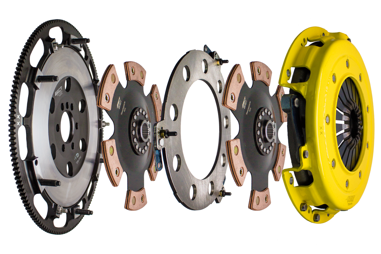 T3R-G02 race, twin disc kit offers twice the number of disc surfaces for better wear, heat capacity and long life compared to single disc kits. These kits use a proprietary Positive Lift Floater System design, which results in quiet operation with no floater rattle and no posts to wear. ACT twin disc kits undergo an exclusive four-stage, heat-treating process on all diaphragms. The ACT twin disc features the ability to adjust for disc wear and provides equal disengagement for discs. ACT's 6-pad rigid race discs are made with high quality, ceramic friction materials. The chrome-moly hub is heat-treated for strength and durability. The lightweight, rigid design allows for quicker shifts and trouble-free service. All ACT twin disc kits include a CNC-machined and dynamically balanced flywheel to ensure trouble-free installation and operation. ACT twin disc kits include a pressure plate, two discs, a floater, flywheel and alignment tool. Some kits may include a pilot bearing and release bearing.