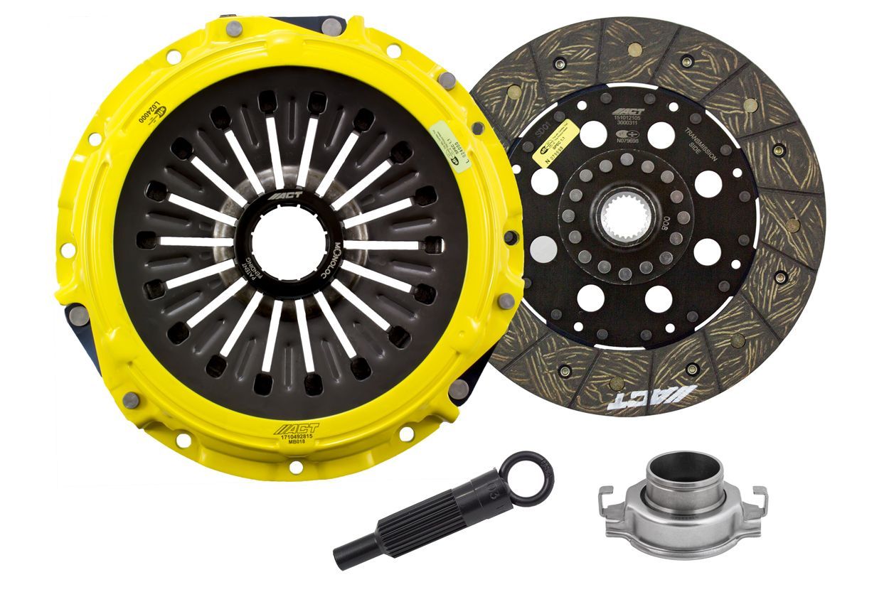 ME2-HDSD kit features ACT's most popular Heavy Duty pressure plate. ACT Heavy Duty pressure plates use exclusive diaphragm design to increase clamp load, reduce deflection and maximize clutch life. All diaphragms endure a four-stage, heat-treating process for unparalleled performance. ACT pressure plates have precision cover stampings to provide rigidity and consistency. ACT Performance street rigid-hub discs feature premium organic materials with high copper content for better heat transfer and steel-backed lining for greater burst strength and durability. The chrome-moly hub is heat-treated for strength and durability. Rivet design and materials are carefully selected for maximum strength. These discs are the minimum weight street disc for faster shifts. ACT's Street rigid-hub discs provide race-proven performance with street manageability. Monoloc is a one-piece, direct replacement or upgrade to the standard, two-piece wedge collar and wire ring featured in pull-type clutches. The spring tension of the segmented retaining ring is carefully calculated and tested for optimal performance. It provides uniform loading on the bearing and pressure plate to assure proper alignment, regardless of driver influence or vehicle modifications. Monoloc's hardened chrome-moly steel construction will provide years of service.