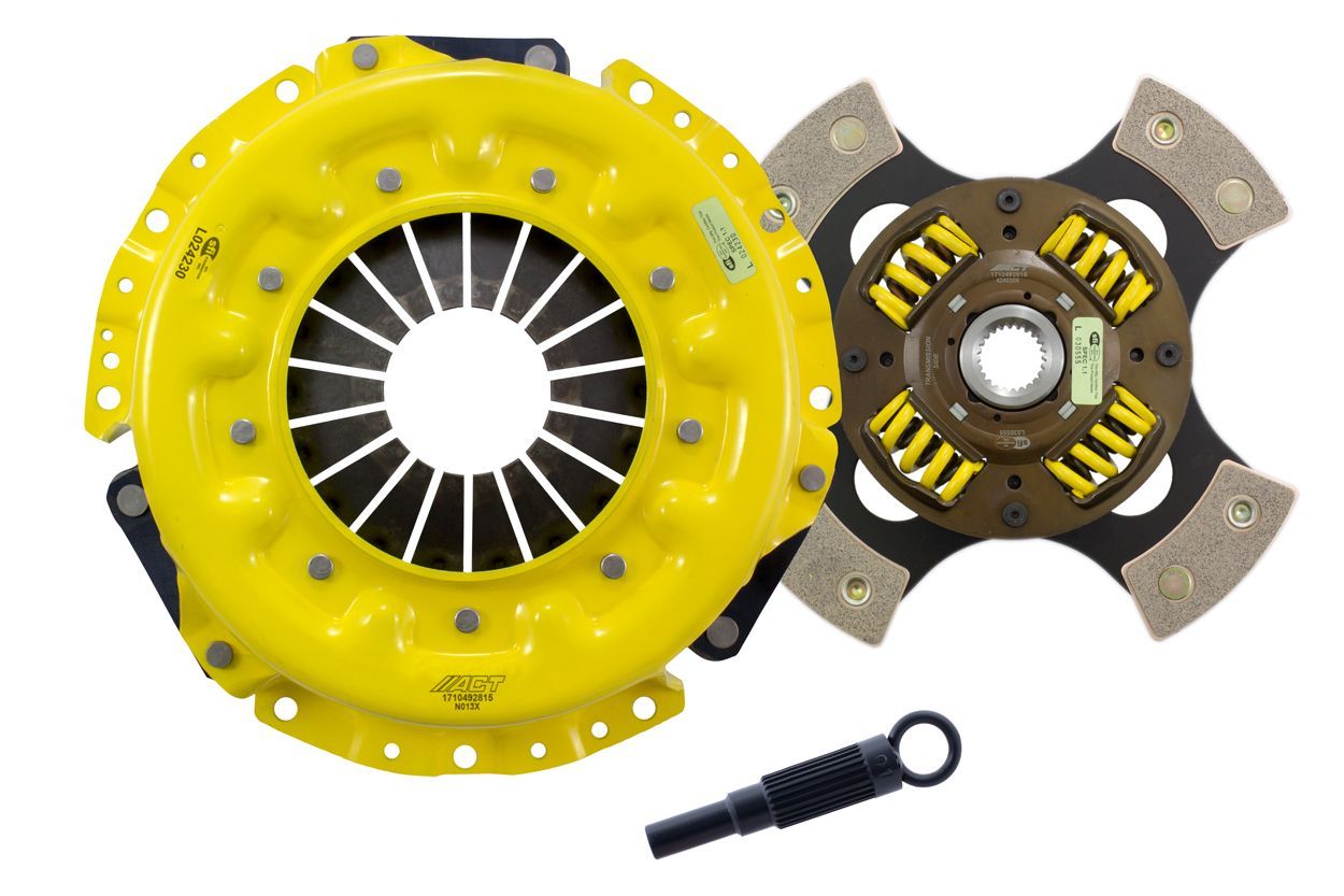 Advanced Clutch Transmission Clutch Kit - NS3-XTG4 ACT Extreme Race Sprung 4 Pad Clutch Kit Manufacturer: Advanced Clutch $573.00 Qty: Add to cart Ship to Select country United States of America Afghanistan Åland Islands Albania Algeria American Samoa Andorra Angola Anguilla Antarctica Antigua and Barbuda Argentina Armenia Aruba Australia Austria Azerbaijan Bahamas Bahrain Bangladesh Barbados Belarus Belgium Belize Benin Bermuda Bhutan Bolivia (Plurinational State of) Bonaire, Sint Eustatius and Saba Bosnia and Herzegovina Botswana Bouvet Island Brazil British Indian Ocean Territory Brunei Darussalam Bulgaria Burkina Faso Burundi Cabo Verde Cambodia Cameroon Canada Cayman Islands Central African Republic Chad Chile China Christmas Island Cocos (Keeling) Islands Colombia Comoros Congo Congo (Democratic Republic of the) Cook Islands Costa Rica Côte d'Ivoire Croatia Cuba Curaçao Cyprus Czechia Denmark Djibouti Dominica Dominican Republic Ecuador Egypt El Salvador Equatorial Guinea Eritrea Estonia Eswatini Ethiopia Falkland Islands (Malvinas) Faroe Islands Fiji Finland France French Guiana French Polynesia French Southern Territories Gabon Gambia Georgia Germany Ghana Gibraltar Greece Greenland Grenada Guadeloupe Guam Guatemala Guernsey Guinea Guinea-Bissau Guyana Haiti Heard Island and McDonald Islands Holy See Honduras Hong Kong Hungary Iceland India Indonesia Iran (Islamic Republic of) Iraq Ireland Isle of Man Israel Italy Jamaica Japan Jersey Jordan Kazakhstan Kenya Kiribati Korea (Democratic People's Republic of) Korea (Republic of) Kuwait Kyrgyzstan Lao People's Democratic Republic Latvia Lebanon Lesotho Liberia Libya Liechtenstein Lithuania Luxembourg Macao Madagascar Malawi Malaysia Maldives Mali Malta Marshall Islands Martinique Mauritania Mauritius Mayotte Mexico Micronesia (Federated States of) Moldova (Republic of) Monaco Mongolia Montenegro Montserrat Morocco Mozambique Myanmar Namibia Nauru Nepal Netherlands New Caledonia New Zealand Nicaragua Niger Nigeria Niue Norfolk Island North Macedonia Northern Mariana Islands Norway Oman Pakistan Palau Palestine, State of Panama Papua New Guinea Paraguay Peru Philippines Pitcairn Poland Portugal Puerto Rico Qatar Réunion Romania Russian Federation Rwanda Saint Barthélemy Saint Helena, Ascension and Tristan da Cunha Saint Kitts and Nevis Saint Lucia Saint Martin (French part) Saint Pierre and Miquelon Saint Vincent and the Grenadines Samoa San Marino Sao Tome and Principe Saudi Arabia Senegal Serbia Seychelles Sierra Leone Singapore Sint Maarten (Dutch part) Slovakia Slovenia Solomon Islands Somalia South Africa South Georgia and the South Sandwich Islands South Sudan Spain Sri Lanka Sudan Suriname Svalbard and Jan Mayen Sweden Switzerland Syrian Arab Republic Taiwan, Province of China Tajikistan Tanzania, United Republic of Thailand Timor-Leste Togo Tokelau Tonga Trinidad and Tobago Tunisia Turkey Turkmenistan Turks and Caicos Islands Tuvalu Uganda Ukraine United Arab Emirates United Kingdom of Great Britain and Northern Ireland United States Minor Outlying Islands Uruguay Uzbekistan Vanuatu Venezuela (Bolivarian Republic of) Vietnam Virgin Islands (British) Virgin Islands (U.S.) Wallis and Futuna Western Sahara Yemen Zambia Zimbabwe * Other * Shipping Method Name Estimated Delivery Price No shipping options Apply Custom wishlist OK Add to wishlist Add to compare list Email a friend NS3-XTG4 kit features an Xtreme pressure plate for the most demanding driver. ACT Xtreme pressure plates use exclusive diaphragm design to increase clamp load, reduce deflection and maximize clutch life. All diaphragms endure a four-stage, heat-treating process for unparalleled performance. ACT pressure plates have precision cover stampings to provide rigidity and consistency. ACT's 4-pad spring-centered race disc features a spring-center construction to properly damp torsional vibrations for quieter operation and resist failure even under harsh conditions. ACT spring retainers utilize wraparound spring windows and thicker retainer stampings to provide spring support, reduce stress concentrations, and increase strength and reliability. With the 4-pad spring-centered race disc, engagement is harsher, but shifting is faster. ACT's 4-pad spring-centered race disc is well-suited for smaller disc sizes in smaller engines.Note: Moderate to heavy pedal effort, aggressive engagement, OE to mild gear rattle; Moderate friction life, extended by ACT's exclusive diaphragm design; Carefully engineered, precisely assembled, accurately balanced, uses select ceramic friction materials for high heat tolerance and maximum performance; Recommended for high horsepower street or race use; 100% clamp load tested and dynamically computer balanced for smooth high RPM reliability Products specifications Attribute name Attribute value Torque Capacity Over OE 123% Product Weight (lbs.) 17.8 Prop 65 Yes/No Yes Prop 65 Long Label Warning: This product can expose you to chemicals including carbon black, glass wool fibers, or silica (in clutch discs), chromium and nickel, which are known to the State of California to cause cancer or birth defects or other reproductive harm. For more information, visit www.P65Warnings.ca.gov Prop 65 - Short Label WARNING: Cancer and Reproductive Harm - www.p65warnings.ca.gov Torque Capacity (ft/lbs.) 630 Input Shaft Diameter 1 Input Spline Quantity 24 Clutch Disc Diameter 240, 9.4 Disc Material Ceramic Clutch Master Cylinder Included No Flywheel Included No Pilot Bushing Included No Release Bearing Included No Clutch Slave Cylinder Included No Flywheel Bolts Included No Pilot Bearing Included No Disc Type Sprung Solid Sprung Pressure Plate Type Xtreme Alignment Tool Included Yes Pressure Plate Bolts Included No Grease Included Yes Grade Type Performance Country of Origin KR Condition New