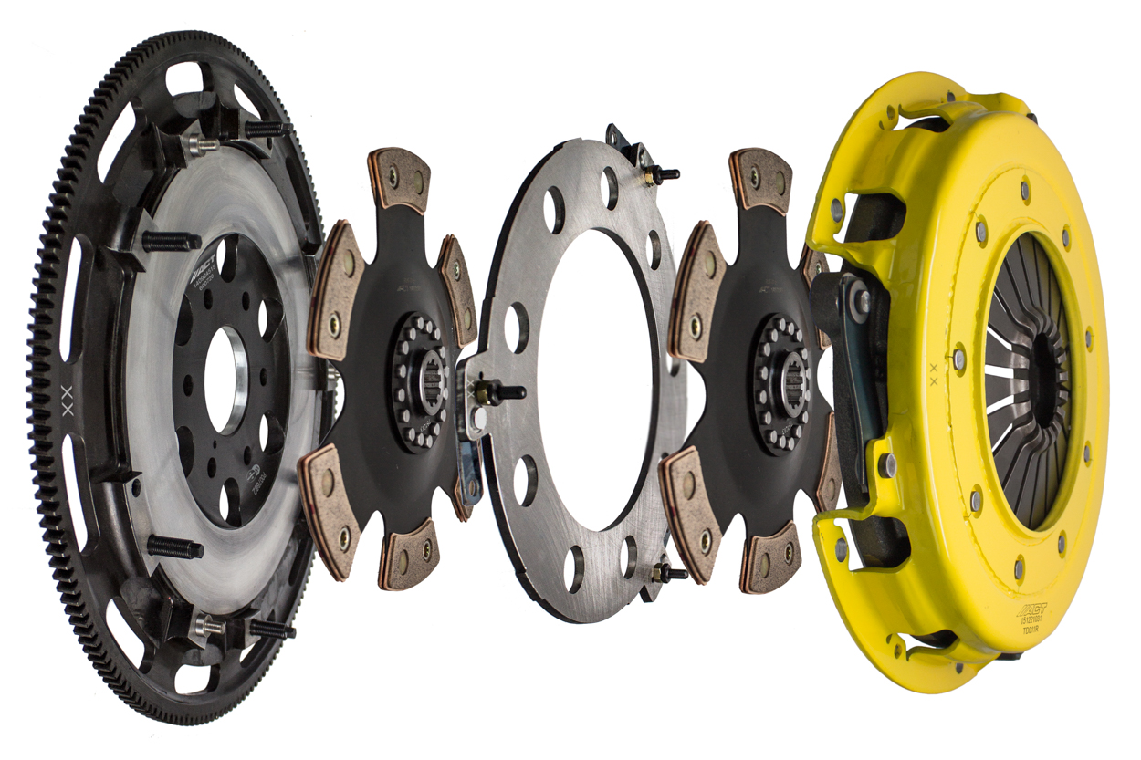T1R-F06 twin disc kit offers twice the number of disc surfaces for better wear, heat capacity and long life compared to single disc kits. These kits use a proprietary Positive Lift Floater System design, which results in quiet operation with no floater rattle and no posts to wear. ACT twin disc kits endure an exclusive four-stage, heat treating process performed on all diaphragms. The ACT twin disc features the ability to adjust for disc wear and provides equal disengagement for discs. ACT's 6-pad rigid race discs are made with high quality, ceramic friction materials. The chrome-moly hub is heat-treated for strength and durability. The lightweight, rigid design allows for quicker shifts and trouble-free service. All ACT twin disc kits include a CNC-machined and dynamically balanced flywheel to ensure trouble-free installation and operation. ACT twin disc kits include a pressure plate, two discs, a floater, flywheel and alignment tool. Some kits may include a pilot bearing and release bearing.