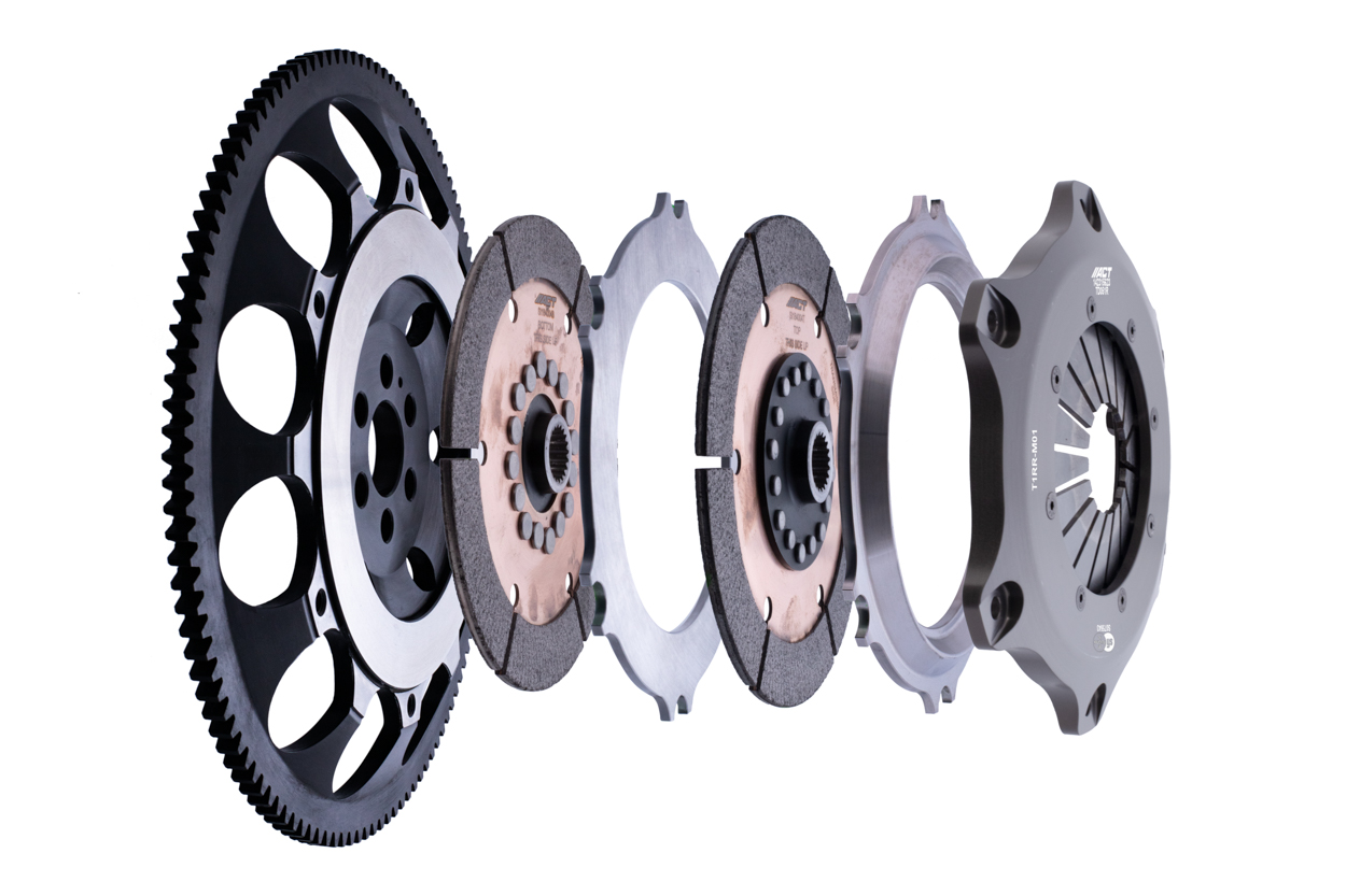 T1RR-M01 race, twin disc kits are race-ready for the serious enthusiast who needs a direct bolt-in kit, requiring no additional modifications. ACT's sintered iron race discs offer the highest torque capacity of all ACT race discs and have ultra-high heat capacity. Most kits offer pedal loads 10-20% higher than stock, yet increasing the clamp load by 80-90%. All ACT twin disc kits include a CNC-machined and dynamically balanced flywheel for trouble free use. All kits undergo an exclusive four-stage, heat-treating process on all diaphragms. ACT twin disc kits include a pressure plate, two discs, floater, flywheel and alignment tool. Some kits may include a pilot bearing and release bearing. ACT Twin disc kits meet SFI Specification 1.2.
