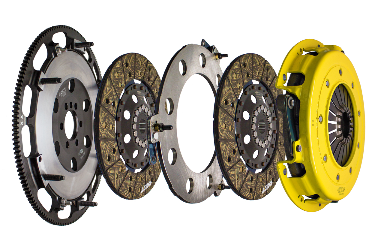 Advanced Clutch Transmission Clutch Kit - T1S-G01 ⚠ Check if this part fits your vehicle Select your vehicle to confirm fitment before you buy. Select vehicle ACT Twin Disc Heavy Duty Street Clutch Kit Manufacturer: Advanced Clutch $1,352.00 Qty: Add to cart Ship to Select country United States of America Afghanistan Åland Islands Albania Algeria American Samoa Andorra Angola Anguilla Antarctica Antigua and Barbuda Argentina Armenia Aruba Australia Austria Azerbaijan Bahamas Bahrain Bangladesh Barbados Belarus Belgium Belize Benin Bermuda Bhutan Bolivia (Plurinational State of) Bonaire, Sint Eustatius and Saba Bosnia and Herzegovina Botswana Bouvet Island Brazil British Indian Ocean Territory Brunei Darussalam Bulgaria Burkina Faso Burundi Cabo Verde Cambodia Cameroon Canada Cayman Islands Central African Republic Chad Chile China Christmas Island Cocos (Keeling) Islands Colombia Comoros Congo Congo (Democratic Republic of the) Cook Islands Costa Rica Côte d'Ivoire Croatia Cuba Curaçao Cyprus Czechia Denmark Djibouti Dominica Dominican Republic Ecuador Egypt El Salvador Equatorial Guinea Eritrea Estonia Eswatini Ethiopia Falkland Islands (Malvinas) Faroe Islands Fiji Finland France French Guiana French Polynesia French Southern Territories Gabon Gambia Georgia Germany Ghana Gibraltar Greece Greenland Grenada Guadeloupe Guam Guatemala Guernsey Guinea Guinea-Bissau Guyana Haiti Heard Island and McDonald Islands Holy See Honduras Hong Kong Hungary Iceland India Indonesia Iran (Islamic Republic of) Iraq Ireland Isle of Man Israel Italy Jamaica Japan Jersey Jordan Kazakhstan Kenya Kiribati Korea (Democratic People's Republic of) Korea (Republic of) Kuwait Kyrgyzstan Lao People's Democratic Republic Latvia Lebanon Lesotho Liberia Libya Liechtenstein Lithuania Luxembourg Macao Madagascar Malawi Malaysia Maldives Mali Malta Marshall Islands Martinique Mauritania Mauritius Mayotte Mexico Micronesia (Federated States of) Moldova (Republic of) Monaco Mongolia Montenegro Montserrat Morocco Mozambique Myanmar Namibia Nauru Nepal Netherlands New Caledonia New Zealand Nicaragua Niger Nigeria Niue Norfolk Island North Macedonia Northern Mariana Islands Norway Oman Pakistan Palau Palestine, State of Panama Papua New Guinea Paraguay Peru Philippines Pitcairn Poland Portugal Puerto Rico Qatar Réunion Romania Russian Federation Rwanda Saint Barthélemy Saint Helena, Ascension and Tristan da Cunha Saint Kitts and Nevis Saint Lucia Saint Martin (French part) Saint Pierre and Miquelon Saint Vincent and the Grenadines Samoa San Marino Sao Tome and Principe Saudi Arabia Senegal Serbia Seychelles Sierra Leone Singapore Sint Maarten (Dutch part) Slovakia Slovenia Solomon Islands Somalia South Africa South Georgia and the South Sandwich Islands South Sudan Spain Sri Lanka Sudan Suriname Svalbard and Jan Mayen Sweden Switzerland Syrian Arab Republic Taiwan, Province of China Tajikistan Tanzania, United Republic of Thailand Timor-Leste Togo Tokelau Tonga Trinidad and Tobago Tunisia Turkey Turkmenistan Turks and Caicos Islands Tuvalu Uganda Ukraine United Arab Emirates United Kingdom of Great Britain and Northern Ireland United States Minor Outlying Islands Uruguay Uzbekistan Vanuatu Venezuela (Bolivarian Republic of) Vietnam Virgin Islands (British) Virgin Islands (U.S.) Wallis and Futuna Western Sahara Yemen Zambia Zimbabwe * Other * Shipping Method Name Estimated Delivery Price No shipping options Apply Custom wishlist OK Add to wishlist Add to compare list Email a friend T1S-G01 street, twin disc kit offers twice the number of disc surfaces for better wear, heat capacity and long life compared to single disc kits. These kits use a proprietary Positive Lift Floater System design, which results in quiet operation with no floater rattle and no posts to wear. ACT twin disc kits endure an exclusive four-stage, heat-treating process on all diaphragms. The ACT twin disc kits features the ability to adjust for disc wear and provides equal disengagement for discs. The Performance street rigid-hub discs feature premium organic materials with high copper content for better heat transfer and steel-backed lining for greater burst strength and durability. The chrome-moly hub is heat-treated for strength and durability. Rivet design and materials are carefully selected for maximum strength. All ACT twin disc kits include a CNC-machined and dynamically balanced flywheel to ensure trouble-free installation and operation. ACT twin disc kits include a pressure plate, two discs, a floater, flywheel and alignment tool. Some kits may include a pilot bearing and release bearing.Note: Light pedal effort, smooth engagement, OE to mild gear rattle; Disc surfaces doubled for better wear, heat capacity and longer life, further extended by ACT's exclusive diaphragm design; Carefully engineered, precisely assembled, accurately balanced, with premium organic friction materials for heat tolerance and reduced fade; Recommended for high horsepower street or race use; 100% clamp load tested and dynamically computer balanced for smooth high RPM reliability Products specifications Attribute name Attribute value SFI 1.2 Torque Capacity Over OE 86% Torque Capacity (ft/lbs.) 891 Part Fitment Requirement Includes ACT Prolite flywheel. Prop 65 - Short Label WARNING: Cancer and Reproductive Harm - www.p65warnings.ca.gov Prop 65 Long Label Warning: This product can expose you to chemicals including carbon black, glass wool fibers, or silica (in clutch discs), chromium and nickel, which are known to the State of California to cause cancer or birth defects or other reproductive harm. For more information, visit www.P65Warnings.ca.gov Flywheel Included Yes Prop 65 Yes/No Yes Product Weight (lbs.) 41.1 Clutch Slave Cylinder Included No Flywheel Bolts Included No Pilot Bearing Included No Clutch Master Cylinder Included No Pilot Bushing Included No Release Bearing Included No Clutch Disc Diameter 10.5, 267 Disc Material Organic Input Spline Quantity 26 Inp