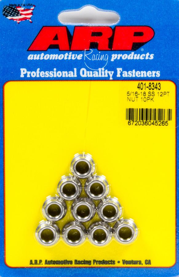 S/S 12pt. Nut - 5/16-18 10pk S/S 12pt. Nut - 5/16-18 10pk Manufacturers: Feber , ARP Availability: In stock SKU: ARP401-8343 Old price: $29.99 Price: $44.18 Qty: Add to cart Ship to Select country United States of America Afghanistan Åland Islands Albania Algeria American Samoa Andorra Angola Anguilla Antarctica Antigua and Barbuda Argentina Armenia Aruba Australia Austria Azerbaijan Bahamas Bahrain Bangladesh Barbados Belarus Belgium Belize Benin Bermuda Bhutan Bolivia (Plurinational State of) Bonaire, Sint Eustatius and Saba Bosnia and Herzegovina Botswana Bouvet Island Brazil British Indian Ocean Territory Brunei Darussalam Bulgaria Burkina Faso Burundi Cabo Verde Cambodia Cameroon Canada Cayman Islands Central African Republic Chad Chile China Christmas Island Cocos (Keeling) Islands Colombia Comoros Congo Congo (Democratic Republic of the) Cook Islands Costa Rica Côte d'Ivoire Croatia Cuba Curaçao Cyprus Czechia Denmark Djibouti Dominica Dominican Republic Ecuador Egypt El Salvador Equatorial Guinea Eritrea Estonia Eswatini Ethiopia Falkland Islands (Malvinas) Faroe Islands Fiji Finland France French Guiana French Polynesia French Southern Territories Gabon Gambia Georgia Germany Ghana Gibraltar Greece Greenland Grenada Guadeloupe Guam Guatemala Guernsey Guinea Guinea-Bissau Guyana Haiti Heard Island and McDonald Islands Holy See Honduras Hong Kong Hungary Iceland India Indonesia Iran (Islamic Republic of) Iraq Ireland Isle of Man Israel Italy Jamaica Japan Jersey Jordan Kazakhstan Kenya Kiribati Korea (Democratic People's Republic of) Korea (Republic of) Kuwait Kyrgyzstan Lao People's Democratic Republic Latvia Lebanon Lesotho Liberia Libya Liechtenstein Lithuania Luxembourg Macao Madagascar Malawi Malaysia Maldives Mali Malta Marshall Islands Martinique Mauritania Mauritius Mayotte Mexico Micronesia (Federated States of) Moldova (Republic of) Monaco Mongolia Montenegro Montserrat Morocco Mozambique Myanmar Namibia Nauru Nepal Netherlands New Caledonia New Zealand Nicaragua Niger Nigeria Niue Norfolk Island North Macedonia Northern Mariana Islands Norway Oman Pakistan Palau Palestine, State of Panama Papua New Guinea Paraguay Peru Philippines Pitcairn Poland Portugal Puerto Rico Qatar Réunion Romania Russian Federation Rwanda Saint Barthélemy Saint Helena, Ascension and Tristan da Cunha Saint Kitts and Nevis Saint Lucia Saint Martin (French part) Saint Pierre and Miquelon Saint Vincent and the Grenadines Samoa San Marino Sao Tome and Principe Saudi Arabia Senegal Serbia Seychelles Sierra Leone Singapore Sint Maarten (Dutch part) Slovakia Slovenia Solomon Islands Somalia South Africa South Georgia and the South Sandwich Islands South Sudan Spain Sri Lanka Sudan Suriname Svalbard and Jan Mayen Sweden Switzerland Syrian Arab Republic Taiwan, Province of China Tajikistan Tanzania, United Republic of Thailand Timor-Leste Togo Tokelau Tonga Trinidad and Tobago Tunisia Turkey Turkmenistan Turks and Caicos Islands Tuvalu Uganda Ukraine United Arab Emirates United Kingdom of Great Britain and Northern Ireland United States Minor Outlying Islands Uruguay Uzbekistan Vanuatu Venezuela (Bolivarian Republic of) Vietnam Virgin Islands (British) Virgin Islands (U.S.) Wallis and Futuna Western Sahara Yemen Zambia Zimbabwe * Other * Shipping Method Name Estimated Delivery Price No shipping options Apply Custom wishlist OK Add to wishlist Add to compare list Email a friend Nut - 5/16-18 in Thread - 3/8 in 12 Point Head - Stainless - Polished - Set of 10 Manufacturer Part #: 401-8343 Products specifications Attribute name Attribute value Product Type Nut, Nut Material Stainless, Stainless Sub Type 5/16-18 in Thread, 5/16-18 in Thread Finish Polished, Polished Unit Set of 10, Set of 10 Specifications 3/8 in 12 Point Head, 3/8 in 12 Point Head